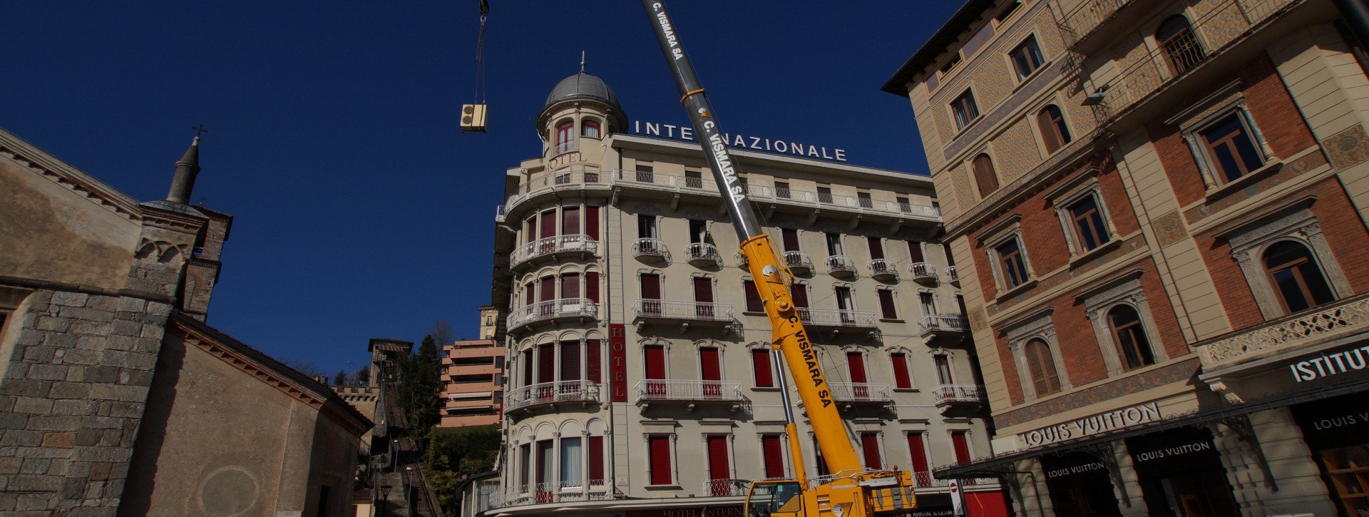 Mit einem imposanten Kran wurden in den Wintermonaten zwei neue Klimaanlagen ( je ca. 500 kg Gewicht) auf dem Dach des Hotels International au Lac in Lugano installiert. Die Unterhaltsarbeiten gehen zu Ende und wir werden das Hotel bald wieder "erfrischt" eröffnen.