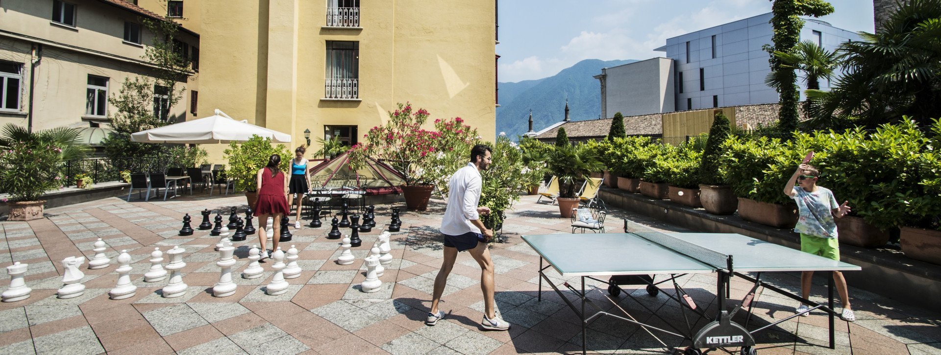 Tischtennis (Pingpong) und ein Riesenschachspiel bieten eine lustige Abwechslung.