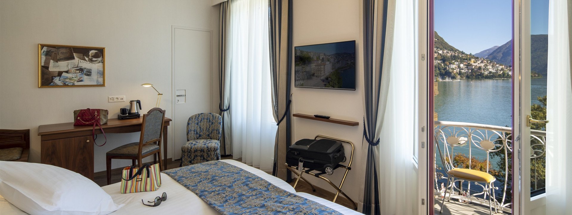 Renoviertes, barrierefreies und rollstuhlgängiges Doppelzimmer ‚Panorama‘, mit Klimaanlage, gratis WiFi, elegantem Parkett, schallisolierten Fenstern, nicht-befahrbarer-Balkon mit direktem Seeblick. Zwei beieinanderstehenden Betten, kleiner Kühlschrank, Kaffee/ Teezubereiter und Behindertgerechtes Badezimmer mit grosszügiger Dusche.