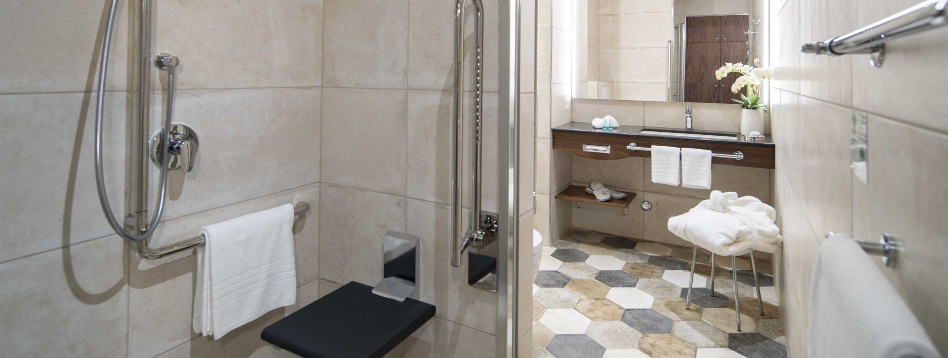 - Hoteleingang über die Garage bis Zimmer: stufenlos (Absatz max. 2,5 cm), nutzbare Türbreiten min. 80 cm, Korridorbreite min. 120 cm, keine Rampen.