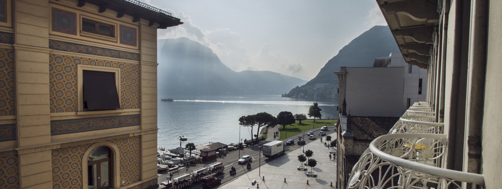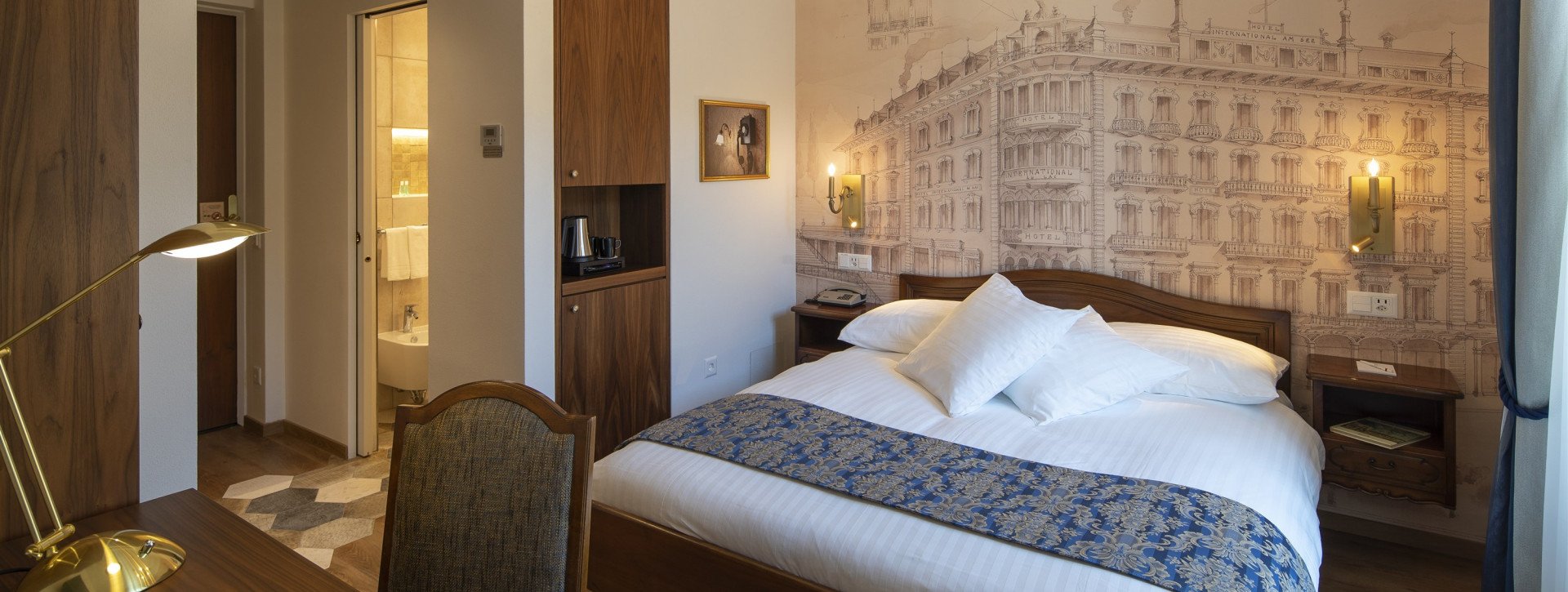 Renoviertes Doppelzimmer ‚Urban Chic‘, mit Klimaanlage, gratis WiFi, elegantem Parkett, schallisolierten Fenstern und Balkon mit seitlichem Seeblick. Ein Doppel- oder zwei beieinanderstehende Betten, kleiner Kühlschrank, Kaffee/Teezubereiter und Badezimmer mit grosszügiger Dusche.